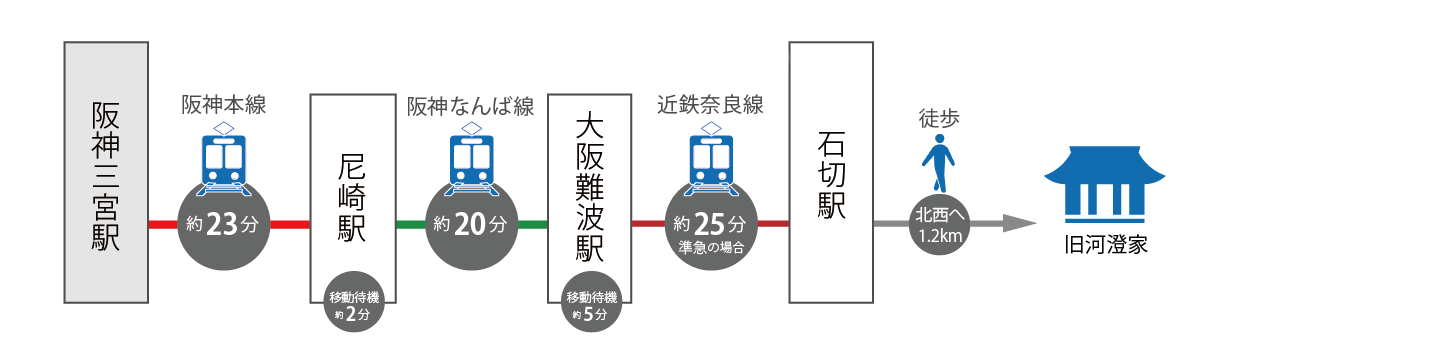 阪神高速道路をご利用の場合、阪神高速13号東大阪線を長田・奈良方面へ「水走出口」を降りて、一般道を利用、国道170号線を越え、「新石切駅前」交差点を左折、約1.5km直進、「日下町4丁目」交差点を左折し、約600m直進