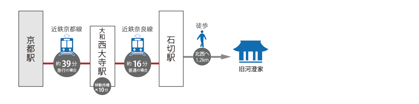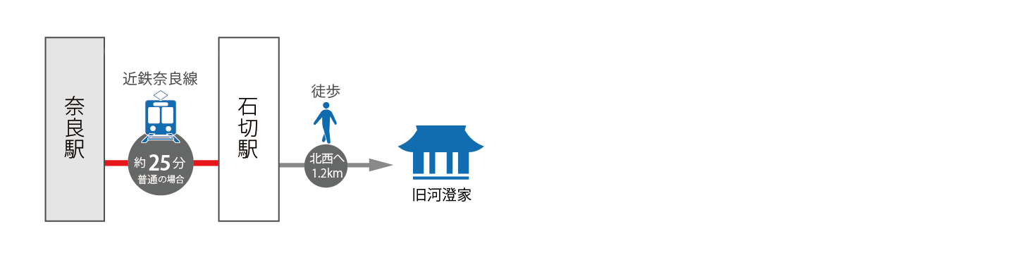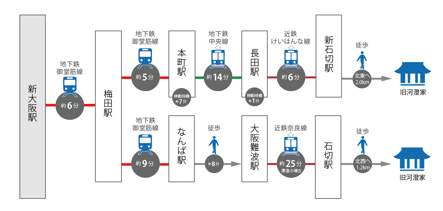 大阪南部方面よりお越しの場合、国道170号線を北上、「被服団地前」を右折、約500m直進、「新石切駅前」交差点を左折、約1.5km直進、「日下町4丁目」交差点を右折し、約600m直進