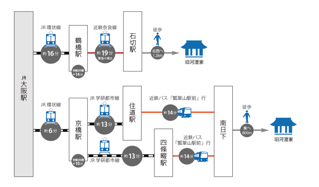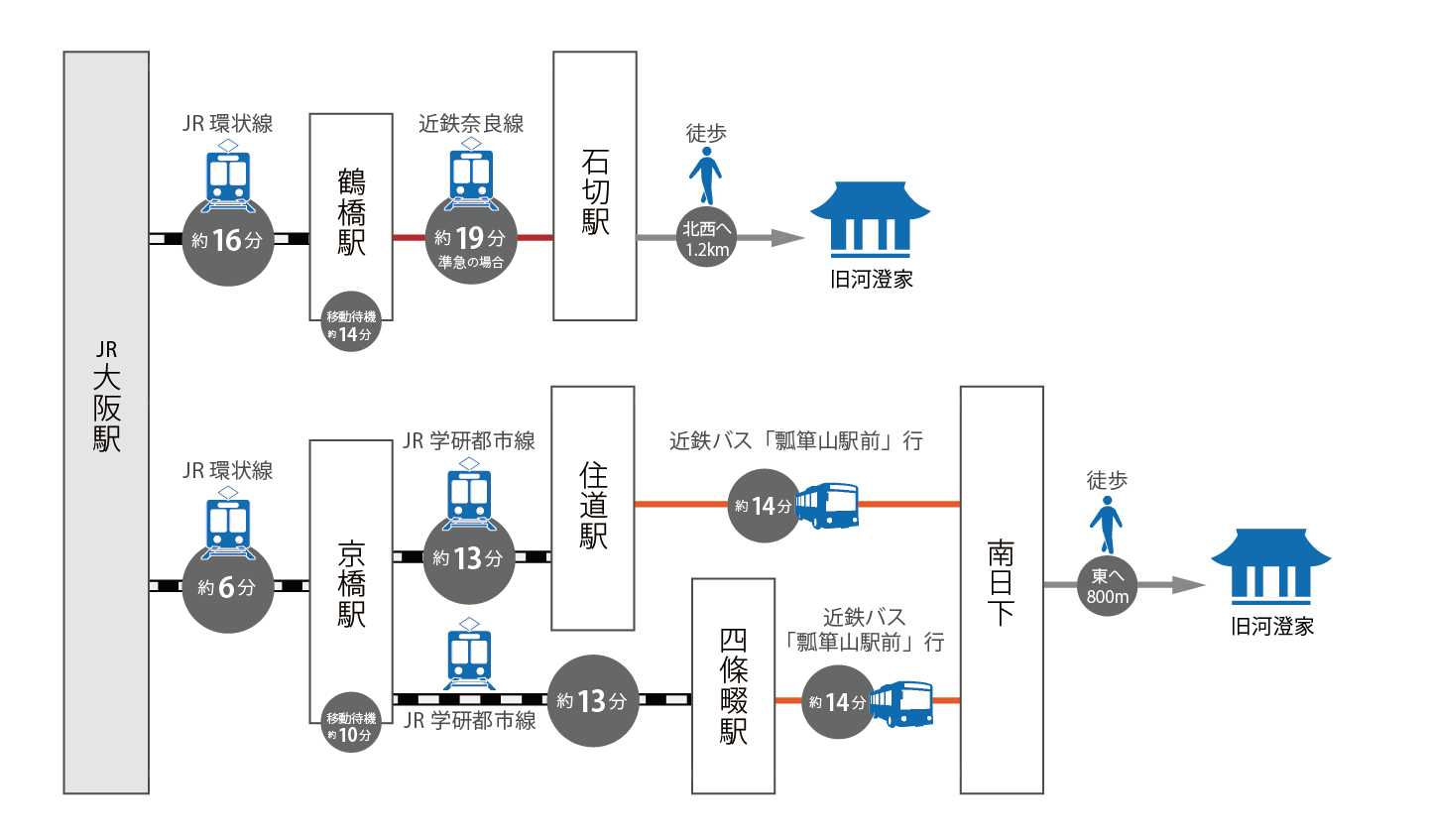 近鉄奈良線「東花園駅」又は近鉄けいはんな線「新石切駅」より、近鉄バス「四條畷」行き又は「住道駅前」行きに乗車 「南日下」バス停より東へ800m