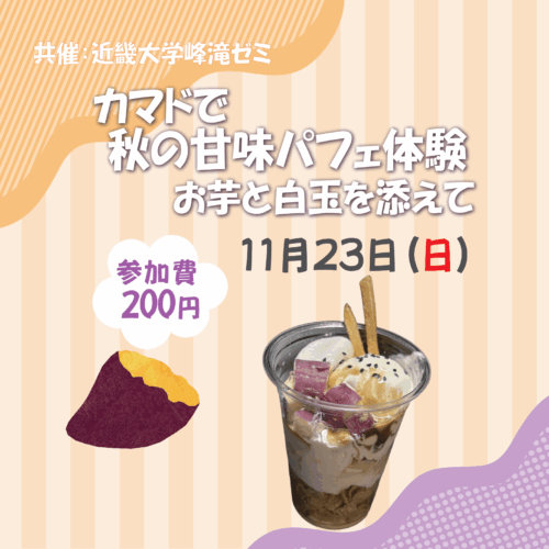近畿大学峰滝ゼミのみなさんと一緒に、カマドで焼いたホクホクのお芋や白玉だんごをつくり、秋らしい甘味パフェをつくります。できあがったパフェを味わったあとは、ゲームなどで楽しいひとときを過ごしましょう!ご参加をお待ちしています。