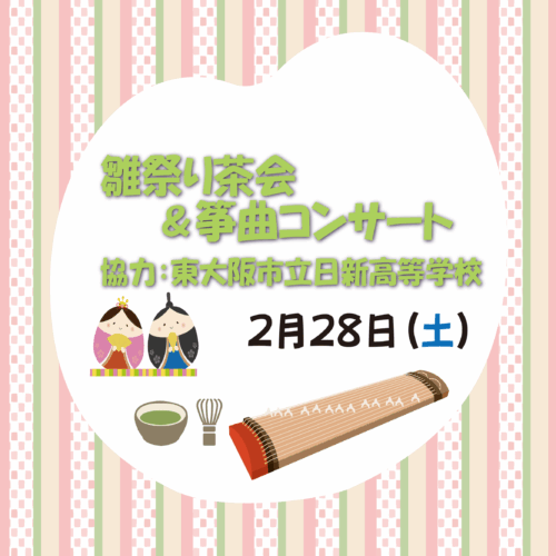 旧河澄家の近くにある東大阪市立日新高等学校 茶道部と箏部の皆さんにご協力いただき、「雛祭り茶会と箏曲コンサート」を開催します。旧家のしつらえの中で、若々しい高校生たちによる心のこもったお点前と優美な筝の音色をお楽しみください。